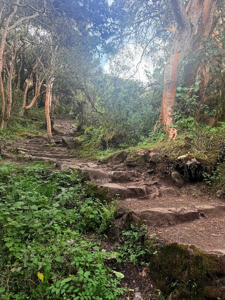 After a small visitor center, we took the obligatory photo and were off. We crossed a footbridge over the Urubamba River, one of the headwaters of the Amazon, and to the Inca, a sacred river. It was believed to mirror the Milky Way, connecting heaven and earth. At this bridge, Orlando stopped us in the middle for our first small ceremony, of which there would be many. He told us to look downstream and have the river take away all that is negative, cleanse us of what we are bringing to the hike. Then we looked upstream and allowed the energy of the river to flow into us—filling the space with positive forces and strength.