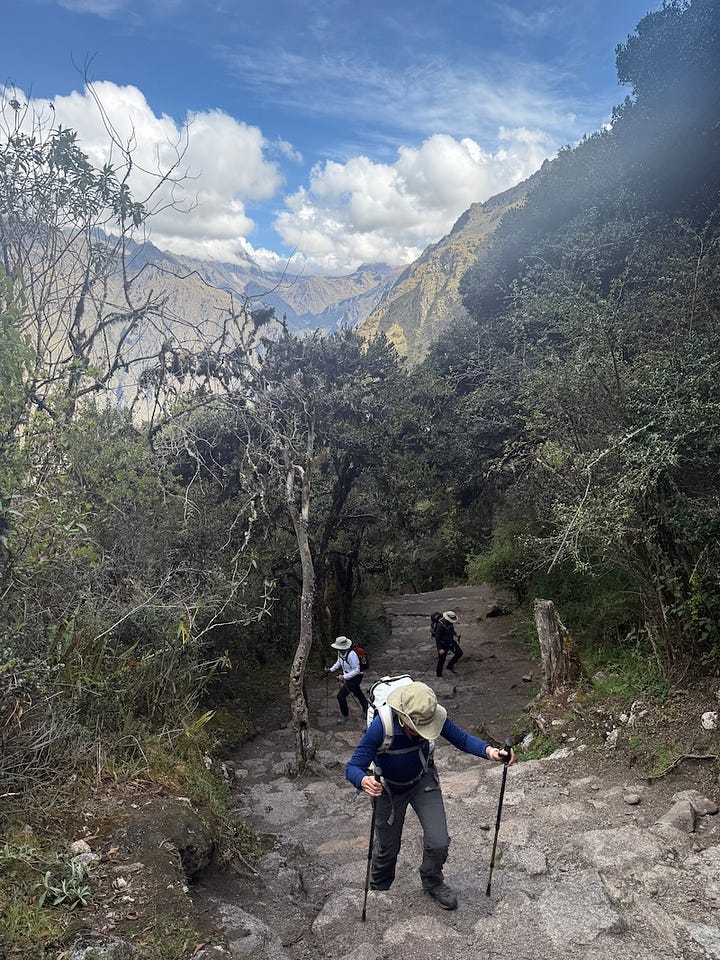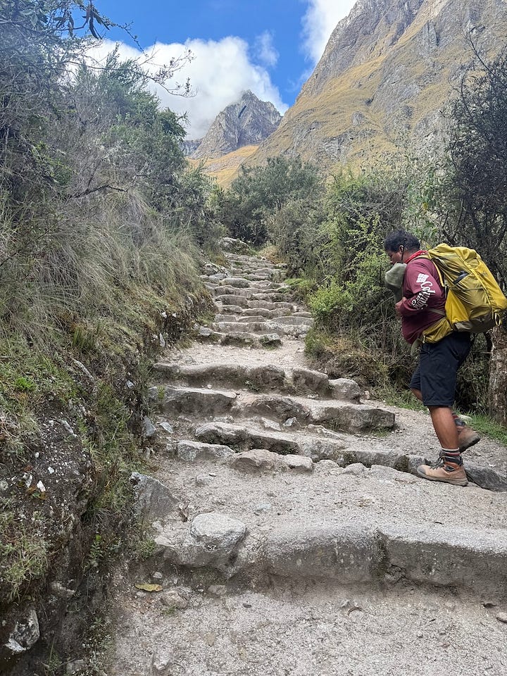 Of our group, we were picked up first. As the van wound its way through the Sacred Valley, we talked with Orlando, our guide. We were in good hands; he’d made the trek around 800 times in the last 25 years. We then met Emma and Pete, who were hiking for their thirtieth wedding anniversary, and later Heidi and James, mother and son. Heidi had dreamed of this trek for 40 years! And just a few weeks earlier, she had made the plans to do it with her son.