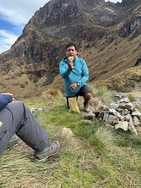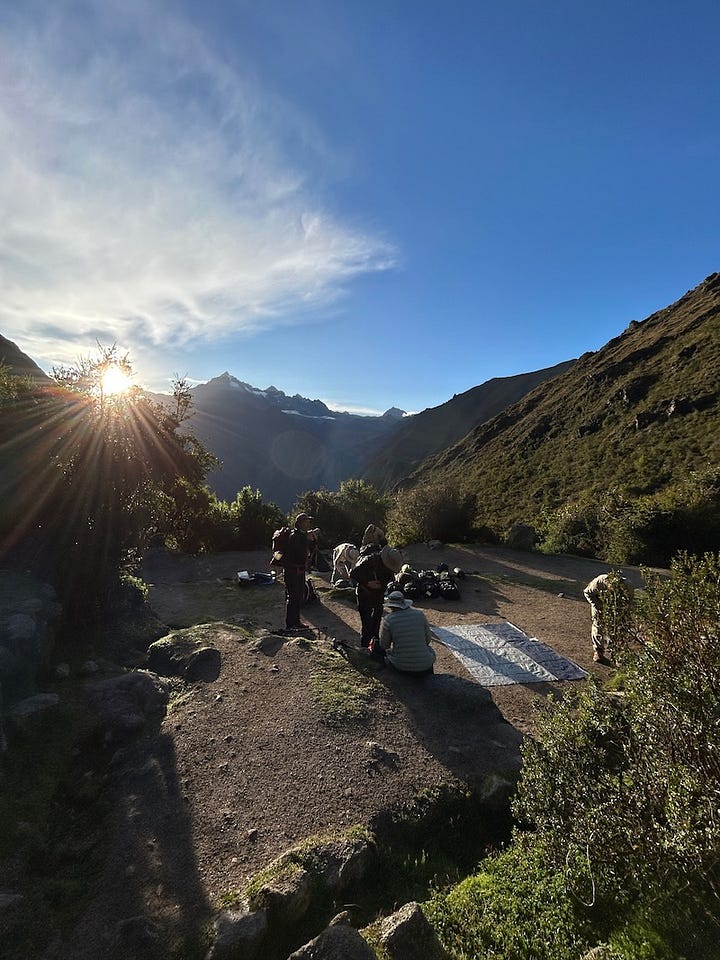 We woke to a beautiful morning (and braying donkeys.) Coffee or coca tea brought to the tent, a tasty breakfast, and an introduction to the team that was supporting our journey, our trail family.
