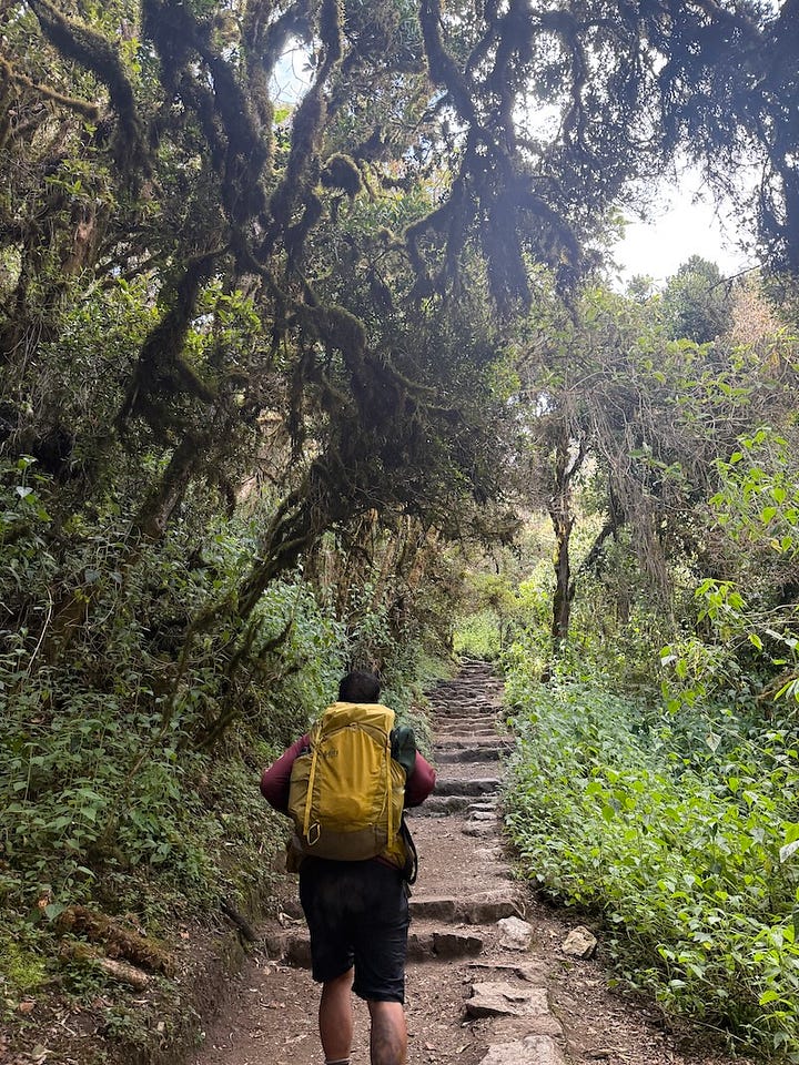 Then, just like that, the van deposited us at the trailhead at Piskakucho. This is when things began to feel real. It was all a bit chaotic as we and the porters were all dealing with shoving things in packs and last-minute adjustments, finding our passports for entry, and getting rubber tips on trekking poles. A local woman with disposable rain ponchos in a basket came by selling them. Emma looked at the sky and bought a couple. The week leading up to the trek was forecast to have fair amounts of rain every day. Later, Emma would say those had been the insurance policy. We never walked in the rain, which at the front edge of the rainy season was amazing. Good thing someone got insurance. We thanked her.