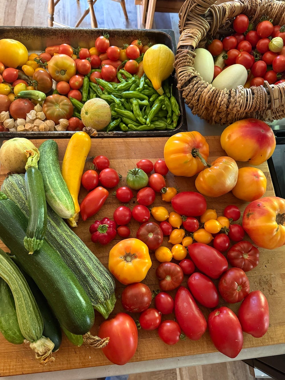 To be fair, it is my turn; I was gone last week visiting another son and his girls. Christopher was the one in charge of all the watering (trees, flowers, and garden) and pets ( ours 🐕🐈🐈 and my grandchildren’s 🐕🦆🦆🦆🦆🦆🦆🐇🐇 🐇+12). We were in the same place for 22 hours, and tag, I was it. The harvest floodgate is open, he’d gathered a big pile of veggies, and I am bringing up more basketfuls daily, which I plan to preserve this weekend before I drive to Palo Alto next week for a Fermented Food Conference at Stanford. I can’t wait. Two dates of gathering “to discuss, explore, and celebrate fermentation.” And I promise to write about what I learn here.